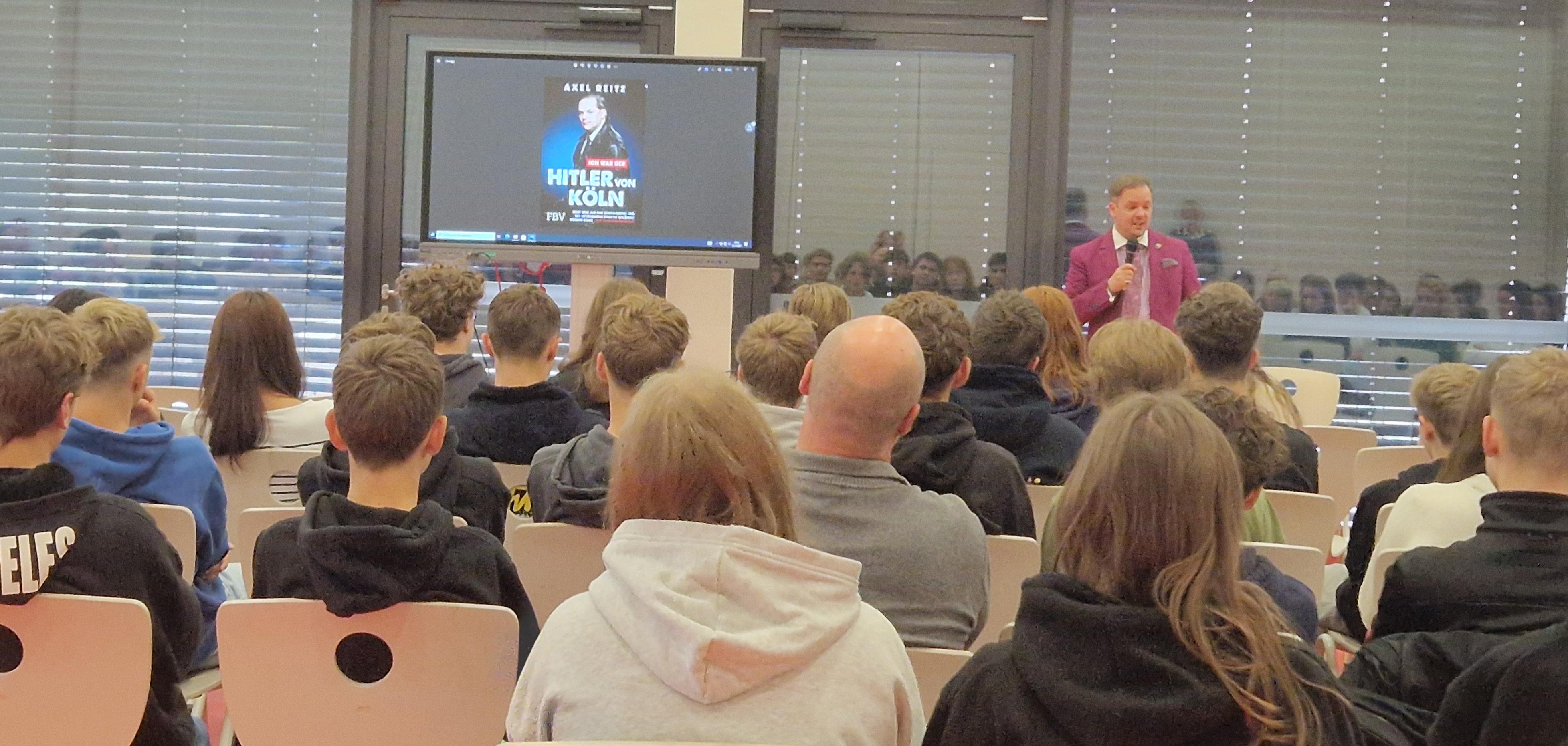 Im Oktober durften wir hier an der Schule Axel Reitz begrüßen, der auf Initiative von Claus Ortmann (Projektbüro Freie Stadt Memmingen) mehrere Schulen in und um Memmingen besuchte. Herr Reitz stellte den Schülern anhand seines Lebenslaufes seinen Weg in die Radikalisierung vor und zeigte mit Hilfe eines schülernahen und eindrücklichen Videos auch verschiedene Radikalisierungsformen auf. Die Schüler und Schülerinnen sollten sensibilisiert werden, dass neben der medialen Präsenz des Rechtsradikalismus´ auch weitere radikale Ansichten in der Gesellschaft vorhanden sind. Wichtig war von Seiten der Schule vor allem der Punkt, wie leicht mit Polemik und lenkender Sprache ein Mensch in eine Informationsblase gerät, aus der er schwer wieder herauskommt.